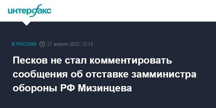 Москва. 27 апреля. INTERFAX.RU - Пресс-секретарь президента РФ Дмитрий Песков оставил без комментариев появившуюся в телеграм-каналах информацию об отставке замминистра обороны РФ Михаила Мизинцева.