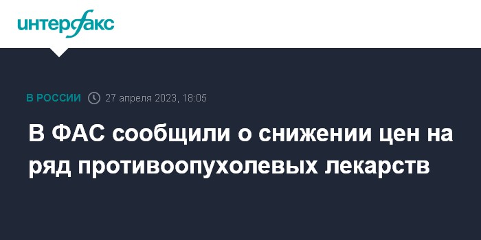Москва. 27 апреля. INTERFAX.RU - Стоимость некоторых противоопухолевых лекарственных препаратов снижена в семь раз; среди них - иностранное лекарство "Сутент" и четыре отечественных дженерика, сообщили в Федеральной антимонопольной службе (ФАС) России.