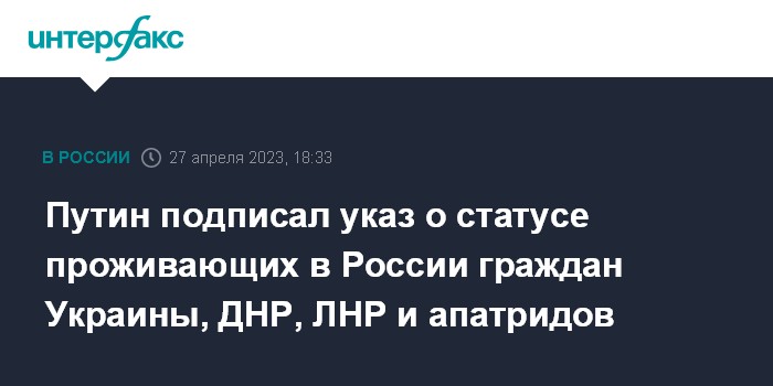 Москва. 27 апреля. INTERFAX.RU - Президент Владимир Путин подписал указ, по которому граждане Украины, ДНР, ЛНР, а также апатриды признаются с 30 сентября 2022 года проживающими в России иностранными гражданами и лицами без гражданства в случае соблюдения ими ряда условий.