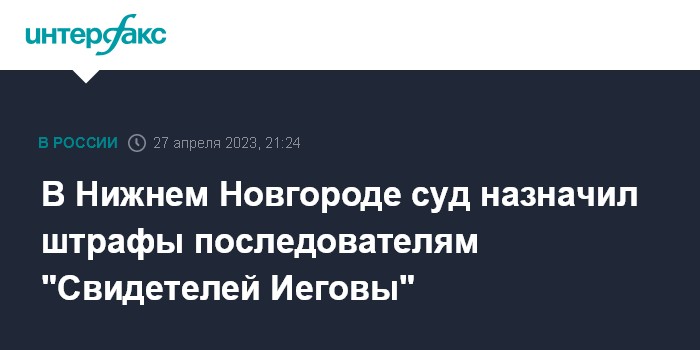 Москва. 27 апреля. INTERFAX.RU - Ленинский районный суд Нижнего Новгорода назначил штрафы участникам экстремистской организации "Управленческий центр Свидетелей Иеговы в России" (признана Верховным судом экстремистской и запрещена), сообщает сайт.