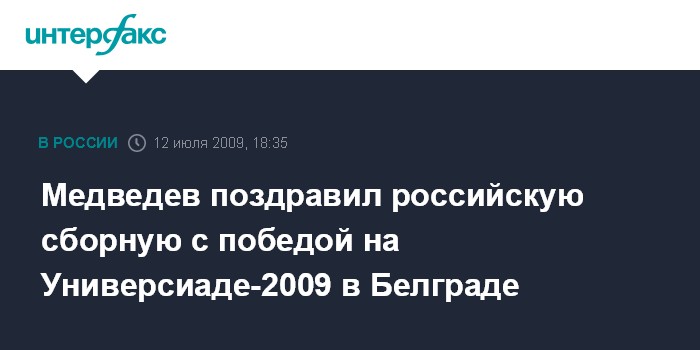 Москва. 12 июля. INTERFAX.RU - Президент России Дмитрий Медведев поздравил российскую студенческую сборную с блестящим выступлением на XXV Всемирной летней Универсиаде-2009 в Белграде.