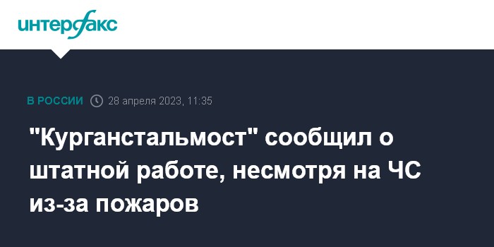 Москва. 28 апреля. INTERFAX.RU - ЗАО "Курганстальмост" работает в обычном режиме, на предприятие не повлияла ситуация с пожарами в Кургане, сообщила компания во "ВКонтакте". 27 апреля сообщалось, что пожар приближался к территории завода.