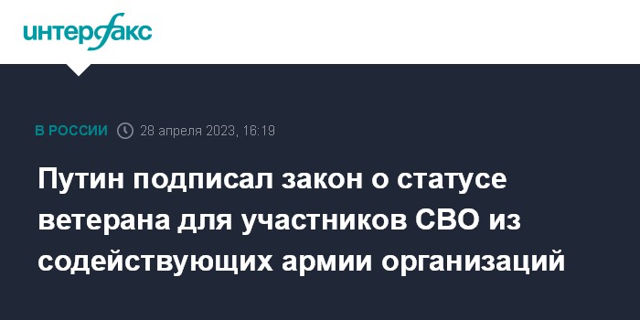 Путин подписал закон о статусе ветерана для участников СВО из содействующих армии организаций