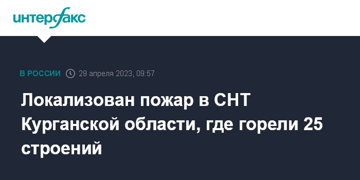 Москва. 29 апреля. INTERFAX.RU - Пожар в садоводческом некоммерческом товариществе "Полянка-2" в Курганской области, где в субботу утром загорелись 25 строений, локализован, сообщает пресс-служба МЧС России.