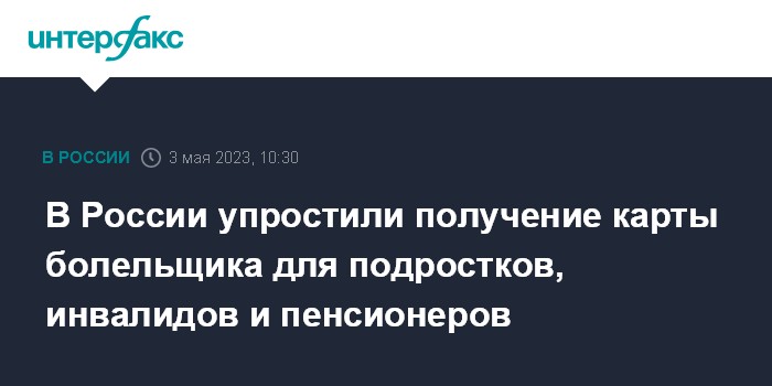 Москва. 3 мая. INTERFAX.RU - Правительство РФ упростило оформление карты болельщика для детей младше 14 лет, инвалидов всех групп, а также пенсионеров, независимо от вида пенсии, сообщается на сайте кабинета министров.