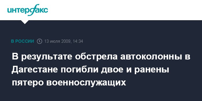 Махачкала. 13 июля. INTERFAX.RU - По уточненным данным, двое военнослужащих погибли, пятеро получили ранения в понедельник в результате обстрела военной автоколонны недалеко от селения Карамахи Буйнакского района Дагестана, сообщил "Интерфаксу" начальник пресс-службы МВД республики Марк Толчинский.
