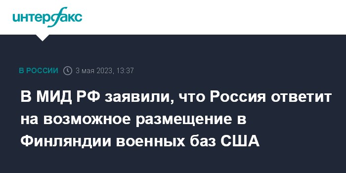 Москва. 3 мая. INTERFAX.RU - Россия ответит на возможное размещение военных баз США на территории Финляндии, заявила официальный представитель МИД РФ Мария Захарова.