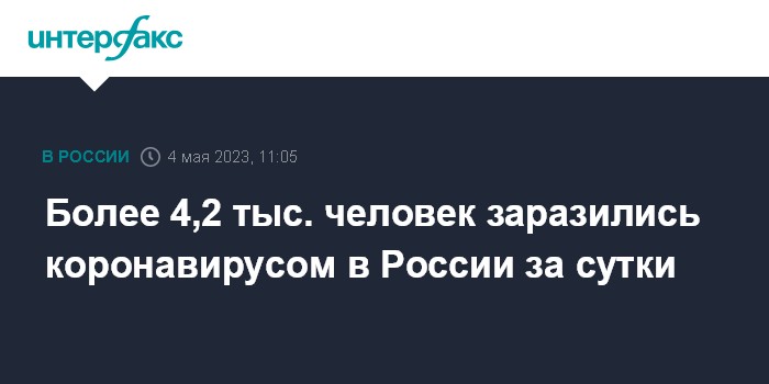 Москва. 4 мая. INTERFAX.RU - Суточный прирост заболевших коронавирусной инфекцией в РФ составил более 4,2 тыс. случаев, скончались 32 пациента с COVID-19, следует из данных оперативного штаба, обнародованных в четверг.