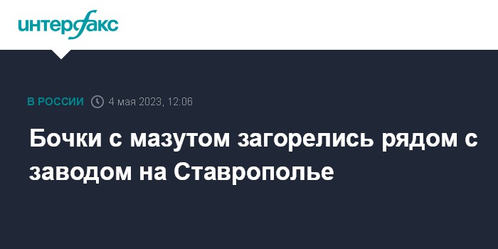 Москва. 4 мая. INTERFAX.RU - Возгорание бочек с мазутом произошло в четверг недалеко от завода "Евробетон" на хуторе Ташла в Шапковском округе Ставропольского края, сообщает главное управление МЧС по региону.