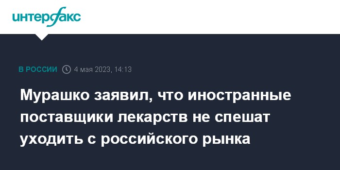 "Иностранные поставщики (лекарств - ИФ) не сильно спешат уходить с рынка. Надо сказать, что для них это определенные объемы продаж, причем рынок емкостью как наша страна, это достаточно приличный рынок", - сказал Мурашко в интервью телеканалу "Россия 24" (ВГТРК).