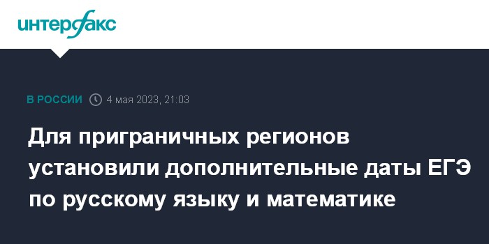 Москва. 4 мая. INTERFAX.RU - Рособрнадзор и Минпросвещения РФ утвердили дополнительные даты ЕГЭ для приграничных регионов РФ; по русскому языку – 30 мая, по математике базового и профильного уровня – 2 июня, сообщили в пресс-службе Рособрнадзора.