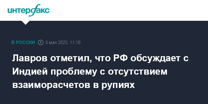 Москва. 5 мая. INTERFAX.RU - Отсутствие взаиморасчетов с Индией в рупиях – проблема для России, этот вопрос обсуждается, заявил глава МИД РФ Сергей Лавров.