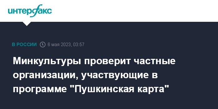 "С 10 по 24 мая 2023 года частные организации культуры, зарегистрированные в программе "Пушкинская карта", пройдут очередной этап проверки на платформе PRO.Культура.РФ на соответствие условиям участия в программе. Данная проверка инициирована Министерством культуры и проводится на регулярной основе", - говорится в сообщении пресс-службы ведомства.