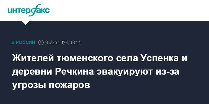 Москва. 6 мая. INTERFAX.RU - Эвакуация жителей идет в селе Успенка и деревне Речкина Тюменского района в связи с возможной угрозой природных пожаров, сообщает в субботу информационный центр правительства Тюменской области.