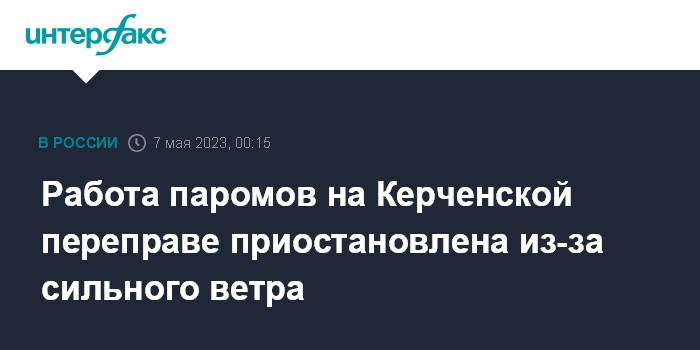 Москва. 7 мая. INTERFAX.RU - Движение паромов на Керченской переправе приостановлено из-за усиления ветра до 17 м/с, сообщило в ночь на воскресенье главное управление МЧС РФ по Крыму со ссылкой на Керченский морской порт.