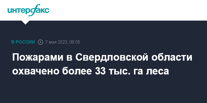 Москва. 7 мая. INTERFAX.RU - В Свердловской области за сутки зафиксировано 53 лесных пожара на площади более 33 тыс. га, сообщает департамент информационной политики региона в воскресенье.