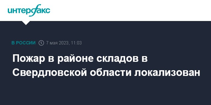 Москва. 7 мая. INTERFAX.RU - Пожар в районе поселка Первомайского в Свердловской области, где огнем были уничтожены два склада, локализован, сообщает в воскресенье пресс-служба регионального МЧС.