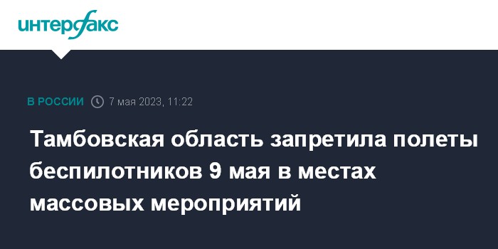Москва. 7 мая. INTERFAX.RU - Власти Тамбовской области ввели запрет на использование беспилотников в местах массовых мероприятий и на прилегающих к ним территориях в День Победы, сообщила в воскресенье пресс-служба облправительства.