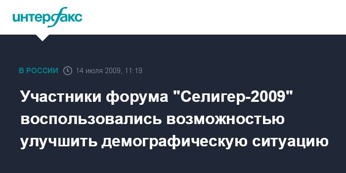 Москва. 14 июля. INTERFAX.RU - Во время сильнейшего ливня на форуме "Селигер-2009" его участники улучшали демографическую ситуацию в России, заявляют организаторы молодежного форума.