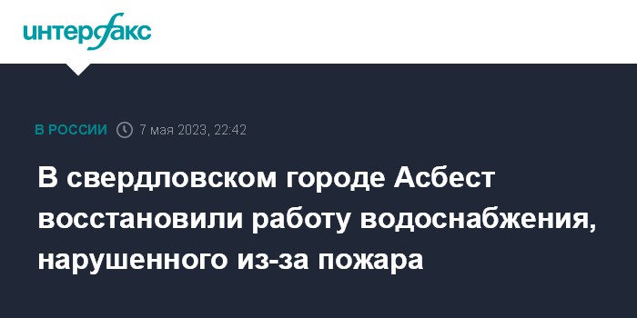 "Вода к полуночи поступила во все дома и объекты Асбеста", - говорится в сообщении ведомства со ссылкой на министра энергетики и ЖКХ региона Николая Смирнова, который контролирует процесс восстановления центрального водоснабжения в городе, нарушенного из-за пожара.
