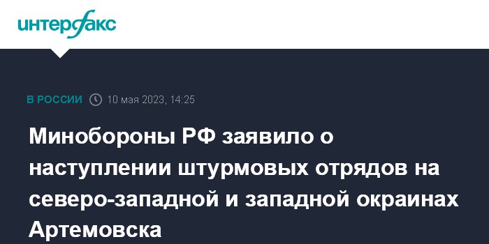Москва. 10 мая. INTERFAX.RU - Штурмовые отряды наступают на северо-западной и западной окраинах Артёмовска (Бахмута), сообщил официальный представитель министерства обороны РФ Игорь Конашенков на брифинге в среду.