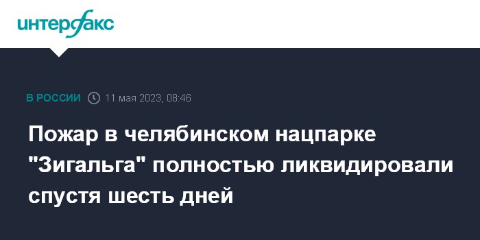 Москва. 11 мая. INTERFAX.RU - Полностью потушен пожар в нацпарке "Зигальга" Челябинской области, с огнем боролись шесть дней, сообщает пресс-служба нацпарка.