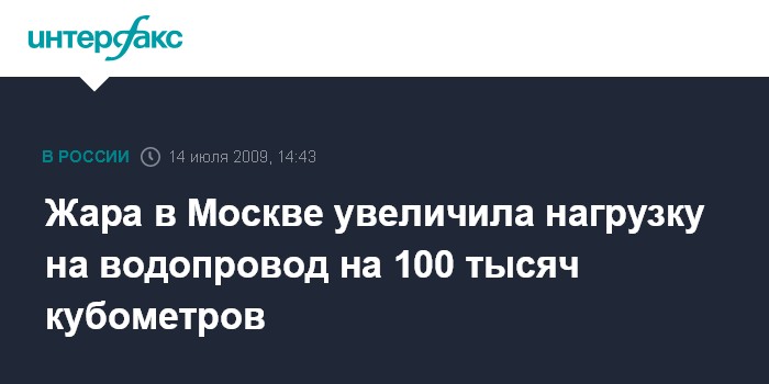 Москва. 14 июля. INTERFAX.RU - С наступлением жарких дней специалистами ГУП "Мосводоканал" зафиксировано увеличение водопотребления в Москве до 3 млн 600 тыс. куб/м в сутки, сообщила во вторник "Интерфаксу" руководитель пресс-службы предприятия Лариса Данилина. "13 июля москвичи использовали, выпили и вылили на себя в душе на 100 тыс. кубометров больше, чем в обычные дни", - сказала Данилина.