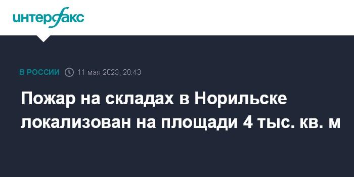 Москва. 11 мая. INTERFAX.RU - Спасатели локализовали возгорание в складских помещениях в районе Вальковского шоссе Норильска, которое произошло днем в четверг, сообщает пресс-служба главного управления МЧС по Красноярскому краю.