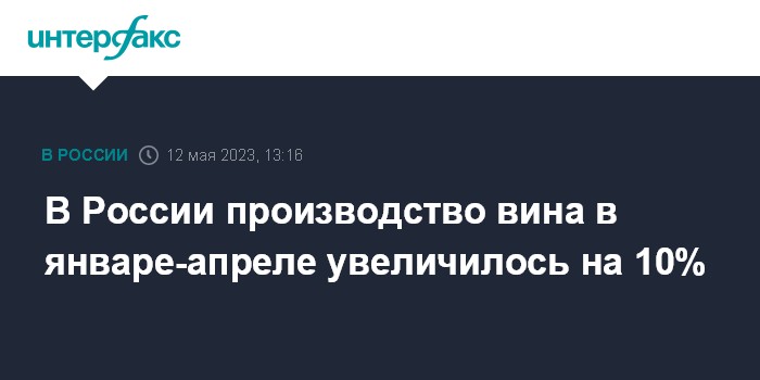 Москва. 12 мая. INTERFAX.RU - В январе-апреле 2023 года производство вина в России выросло на 10% в годовом измерении, сообщила на Форуме винного туризма в Абрау-Дюрсо замдиректора департамента пищевой и перерабатывающей промышленности Минсельхоза Ирина Федина.