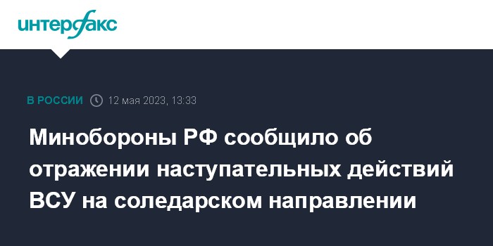 Москва. 12 мая. INTERFAX.RU - На соледарском направлении вооруженные силы Украины предприняли 26 атак, прорывов обороны российских войск не допущено, заявили в Минобороны РФ.