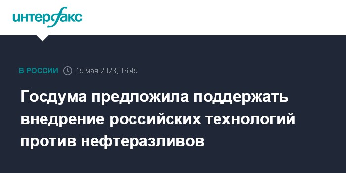 Москва. 15 мая. INTERFAX.RU - Госдума предложила правительству предоставить меры поддержки организациям, которые применяют отечественные технологии против разливов нефти и нефтепродуктов, следует из проекта постановления парламента.
