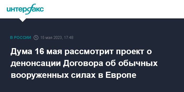 "По итогам Совета Думы законопроект о денонсации Россией ДОВСЕ включен в повестку заседаний Госдумы на вторник, 16 мая", - сообщил Слуцкий журналистам в понедельник.