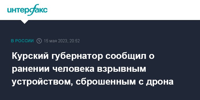 Москва. 15 мая. INTERFAX.RU - В Курской области экскаваторщик был ранен при взрыве устройства, сброшенного с украинского беспилотника, сообщил в Telegram губернатор региона Роман Старовойт.