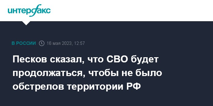 Песков сказал, что СВО будет продолжаться, чтобы не было обстрелов территории РФ