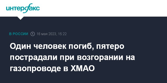 Москва. 16 мая. INTERFAX.RU - В Белоярском районе Ханты-Мансийского автономного округа при ремонте газопровода возник пожар. Один человек погиб, еще пятеро пострадали, сообщил в Telegram директор департамента здравоохранения Ханты-Мансийского автономного округа - Югры Алексей Добровольский.