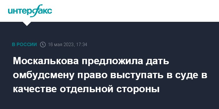 Москва. 16 мая. INTERFAX.RU - Уполномоченный по правам человека в РФ Татьяна Москалькова предложила дать омбудсмену право выступать в суде в качестве отдельной стороны.