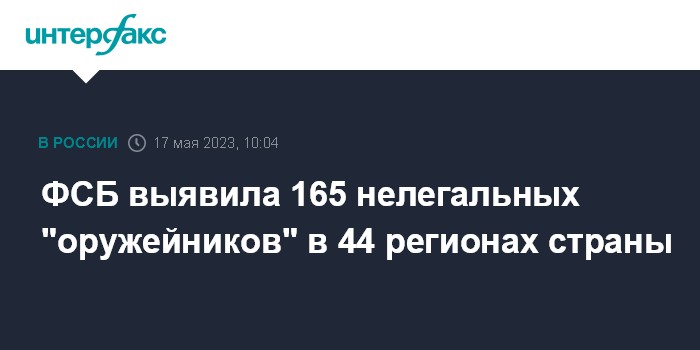 Москва. 17 мая. INTERFAX.RU - ФСБ провела спецоперацию против так называемых нелегальных оружейников в 44 регионах страны: выявлены 165 человек, изъято большое количество оружия и боеприпасов, прекращена работа 40 подпольных мастерских.