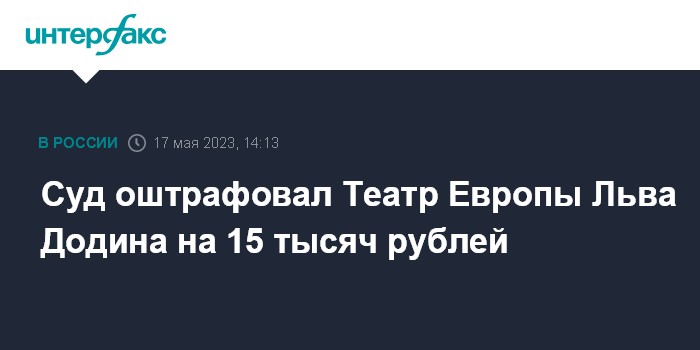 Москва. 17 мая. INTERFAX.RU - В Петербурге Куйбышевский районный суд Петербурга привлек Малый драматический театр (Театр Европы) Льва Додина к административной ответственности за санитарные нарушения и оштрафовал на 15 тысяч рублей, сообщила пресс-служба судов города.