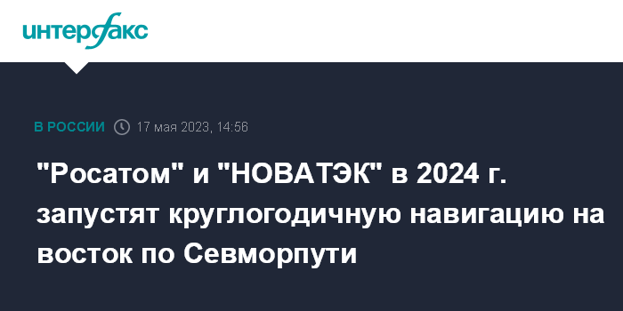Москва. 17 мая. INTERFAX.RU - "Росатом" совместно с "НОВАТЭКом" в начале следующего года запустят круглогодичную навигацию на восточном направлении Северного морского пути (СМП). Об этом сообщил глава "Росатома" Алексей Лихачев на совещании с президентом РФ Владимиром Путиным.