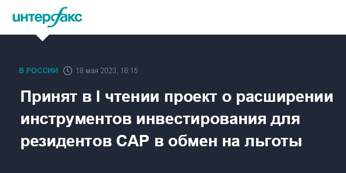 Принят в I чтении проект о расширении инструментов инвестирования для резидентов САР в обмен на льготы