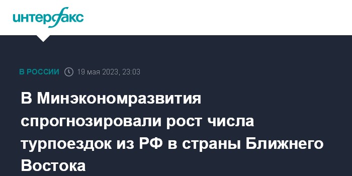 Москва. 19 мая. INTERFAX.RU - Число поездок российских туристов в страны Ближнего Востока может вырасти в 1,5 раза в 2023 году и превысить 2 млн, сообщил в пятницу замминистра экономического развития РФ Дмитрий Вахруков.