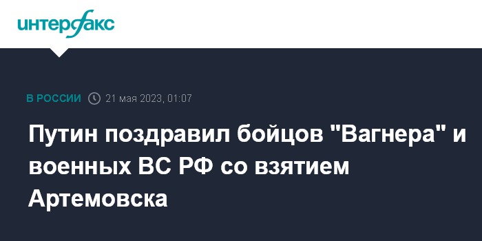 Москва. 21 мая. INTERFAX.RU - Президент РФ Владимир Путин поздравил бойцов группы "Вагнер" и военных ВС РФ с установлением контроля над Артемовском (Бахмутом), сообщает пресс-служба Кремля.