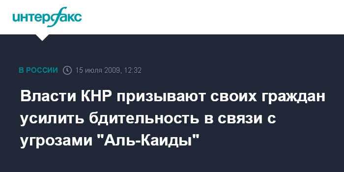 Москва. 15 июля. INTERFAX.RU - Власти Китая предупредили граждан страны и китайские организации за границей об угрозе возможных террористических атак после того, как алжирская ячейка "Аль-Каиды" пригрозила нанести удар по китайским предприятиям и гражданам в Северной Африке, сообщила в среду газета "Чайна дейли".