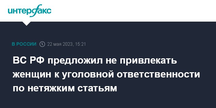 Москва. 22 мая. INTERFAX.RU - Верховный суд России предложил не привлекать к уголовной ответственности женщин, впервые совершивших нетяжкие преступления.