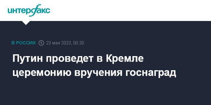 Москва. 23 мая. INTERFAX.RU - 23 мая в Екатерининском зале Кремля состоится церемония вручения президентом Российской Федерации государственных наград, сообщила пресс-служба Кремля.