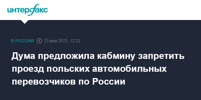 Москва. 23 мая. INTERFAX.RU - Госдума во вторник проголосовала за обращение к правительству России с просьбой исключить возможность "выполнения перевозок польскими автомобильными перевозчиками по территории РФ".