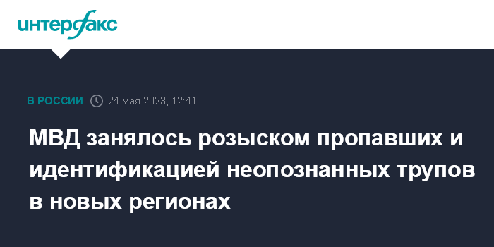 Москва. 24 мая. INTERFAX.RU - МВД организована работа по розыску пропавших без вести, а также по идентификации неопознанных трупов граждан, погибших в результате боевых действий в новых субъектах РФ.