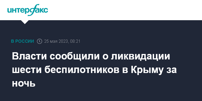 Москва. 25 мая. INTERFAX.RU - Российские военные ликвидировали шесть беспилотников в разных районах Крыма в ночь на четверг, сообщил глава республики Сергей Аксенов.