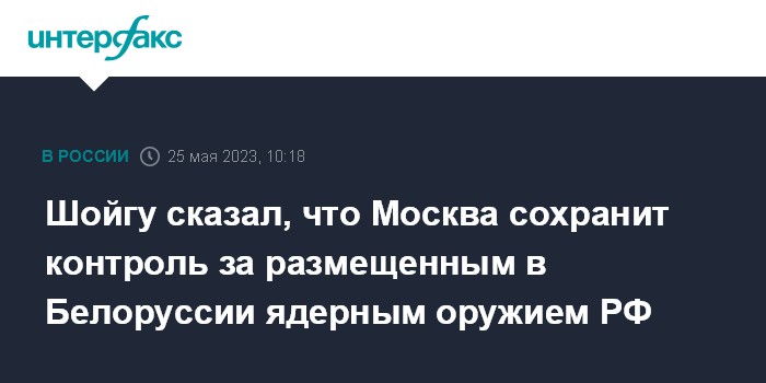 Москва. 25 мая. INTERFAX.RU - Россия, размещая нестратегическое ядерное оружие на территории Белоруссии, не передает его республике, контроль над ним и решение о применении остается за Москвой, сообщил министр обороны РФ Сергей Шойгу в четверг