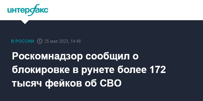 Москва. 25 мая. INTERFAX.RU - Роскомнадзор с 24 февраля 2022 года заблокировал в рунете более 172 тысяч материалов с недостоверной общественно значимой информацией о специальной военной операции. Об этом сообщила пресс-служба ведомства.